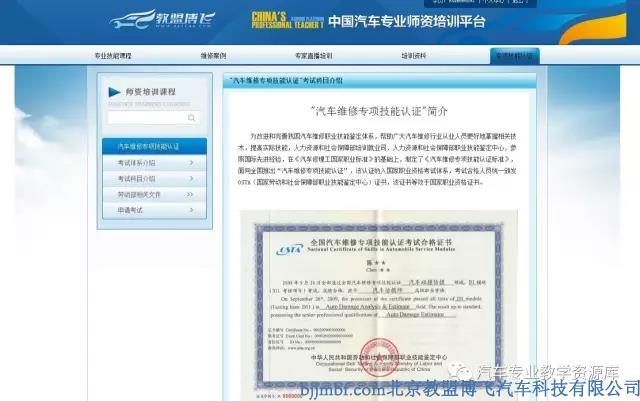 专项技能认证:学完规定学时,即可以申请参加 “汽车维修专项技能认证”考试,考试合格颁发国家劳动和社会保障部职业技能鉴定中心专项技能认证证书。