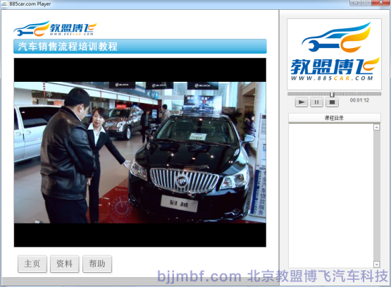 《汽车销售流程视频教程》全景视频教学系统结合厂家标准服务规范流程,标准化操作完成预约客户、接车、维修质检、结算交车跟踪服务等一系列完整售后服务流程;教学系统运用平面、视频、多维动画技术形成一套集讲授、实景演示、重点回顾、原厂服务商务标准等立体视频教学系统;完整详细的汽车服务过程中标准流程,服务礼仪、标准话术、各种细节及服务技巧;弥补传统视频画面单一,重点不突出,标准规范不明显等缺点;立体视频教学系统同时具备一定的自动考核、教学环境识别等功能,从而提高学习和训练效率。