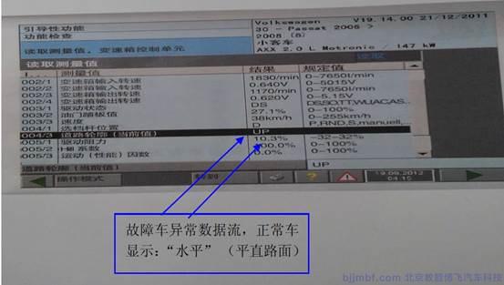 用VAS5052A 重点检查变速箱电路方面及控制方面,读取02-数据流,数据块004-3 区无论车辆在上坡 平直路面还是下坡一直显示“UP”,即上坡模式;005 组第二区“HILL(坡度系数)”一直在60%-100%变化。正常车应该随着路况而变化。根据数据流的分析可以得出变速箱升档慢的原因是由于变速箱一直处在爬坡状态,(爬坡变速箱要降速增扭)数据流如下图。