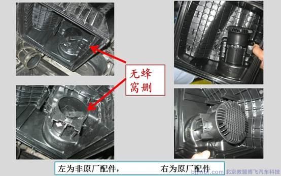 对比正常的空气滤清器壳体,该车的空气滤清器壳体上,安装MAF的进气管管口,没有蜂窝删,这个蜂窝删,并不是过滤空气用的,而是调整气流,使进气气流连续的按照一定的方向流过MAF,可以说是与MAF采样相配合。如果没有这个蜂窝删,气流会由于进气脉动以及进气管的阻力,出现不稳地的紊流,通过MAF,造成MAF检测的空气流量大于实际进入气缸的气流量。