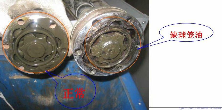 5.进一步确认后,将左半轴拆下,进行仔细检查,对其半轴进行晃动听到内球笼有异响,像是缺少球笼油而引起的。对其内球笼上盖进行拆卸,发现内球笼球严重缺乏润滑脂。故障点找到。