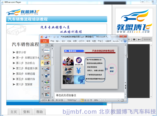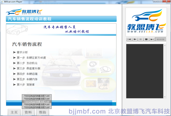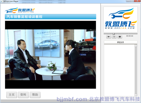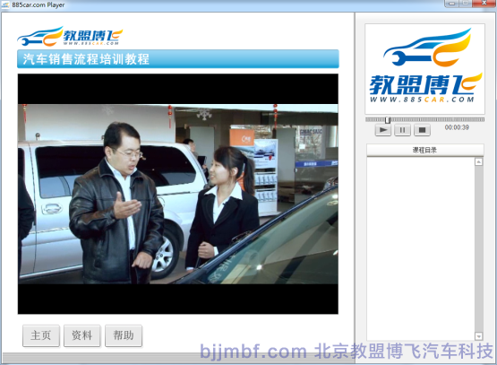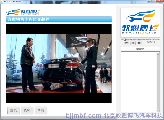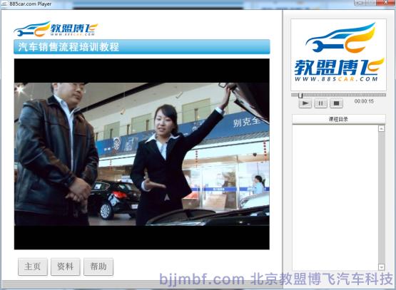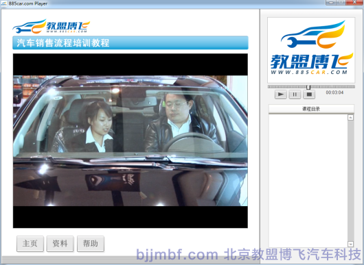 《汽车销售流程视频教程》全景视频教学系统结合厂家标准服务规范流程,标准化操作完成预约客户、接车、维修质检、结算交车跟踪服务等一系列完整售后服务流程;教学系统运用平面、视频、多维动画技术形成一套集讲授、实景演示、重点回顾、原厂服务商务标准等立体视频教学系统;完整详细的汽车服务过程中标准流程,服务礼仪、标准话术、各种细节及服务技巧;弥补传统视频画面单一,重点不突出,标准规范不明显等缺点;立体视频教学系统同时具备一定的自动考核、教学环系统内容包含